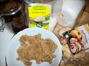 Du nimmst zu gleichen Teilen Kokosraspeln und Rosinen oder andere Trockenfrüchte (in diesem Fall habe ich getrocknete Apfelscheiben und Rosinen verwendet) und mixt sie mit etwas geriebener gefrorenen Zitrone (mit Schale und Fruchtfleisch), Zimt, Vanillepulver und als Flüssigkeit etwas Aloe Vera Gel und Granatapfelsaft zu einer knetbaren Masse. Hier siehst du ein paar der Zutaten, die ich verwendet habe und die Masse, die ich vorerst zur Seite gestellt habe: