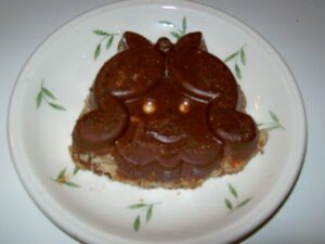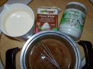 Jetzt heißt es, eine Schokolade zuzubereiten: aus nativem Kokosöl, Carob oder Rohkakao-Pulver, Stevia oder Xylith oder einem anderen alternativen Süßungsmittel. Ich persönlich mag die Schokolade lieber, wenn sie etwas heller ist und füge daher gerne etwas Nussmus aus Mandeln oder Haselnüssen bei. Das Ganze wird bei sanfter Hitze geschmolzen und dann1-2 mm hoch in den Boden von Puddingformen gefüllt und kurz im Frierfach zum Festwerden gebracht. Wer mag, kann sich jetzt noch spielen und auch die Ränder mit Schokolade ausstreichen und nochmals fest werden lassen.