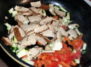 Falls du Zwiebel verwendest, beginnst du damit, sie in Kokosöl anzudünsten und fügst anschließend alle weiteren Zutaten bei; andernfalls kannst du gleich alles in eine Pfanne geben und etwa drei Minuten durchrösten.