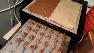 2. Die dunkle Masse wurde zur Hälfte im Stück auf den restlichen Teil der Schoko-Ananas-Masse geklappt und ebenfalls zu Talern ausgestochen. Auch dies war nun bereit zum Trocknen.