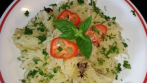 Wenn die Kürbishälften gar sind (beim Hineinstechen mit einer Gabel spürt man das), kannst du entweder jeden selbst die Spaghetti “herausgabeln” lassen oder du bereitest alles vor: Mit einer Gabel ziehst du der Länge nach die “Spaghettis” heraus. Du wirst erstaunt sein, wie leicht und einfach das geht! Du kannst die Spaghetti gleich direkt auf Tellern anrichten oder in einer Pfanne durchmischen und dann mit Petersilie bestreut anrichten.